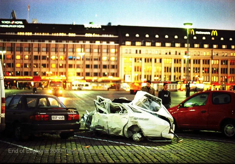 A crashed car was carefully painted entirely in glossy white and placed in a parking lot surrounded by ordinary parked cars with other cars and people passing by. The installation End of Euphoria was placed in the centre of Turku for several weeks near the Market Square and Turku administration building Virastotalo as part of Arte R.Y. VIRASTO City Art Event 2003.